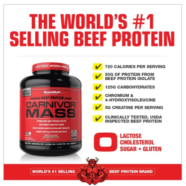 مس کارنیور ماسل مدز (MuscleMeds CARNIVOR MASS) نسخهای انقلابی از مکملهای افزایش وزن و حجم است که با استفاده از پروتئین استخراجشده از گوشت گاو هیدرولیزه، بدون هیچگونه لاکتوز یا قند لبنی، انرژی و عضلهسازی شما را به سطحی جدید میبرد. این گینر از برند مطرح آمریکایی MuscleMeds در مدت کوتاهی به یکی از پرطرفدارترین محصولات در بین بدنسازان حرفهای ایران تبدیل شده است.